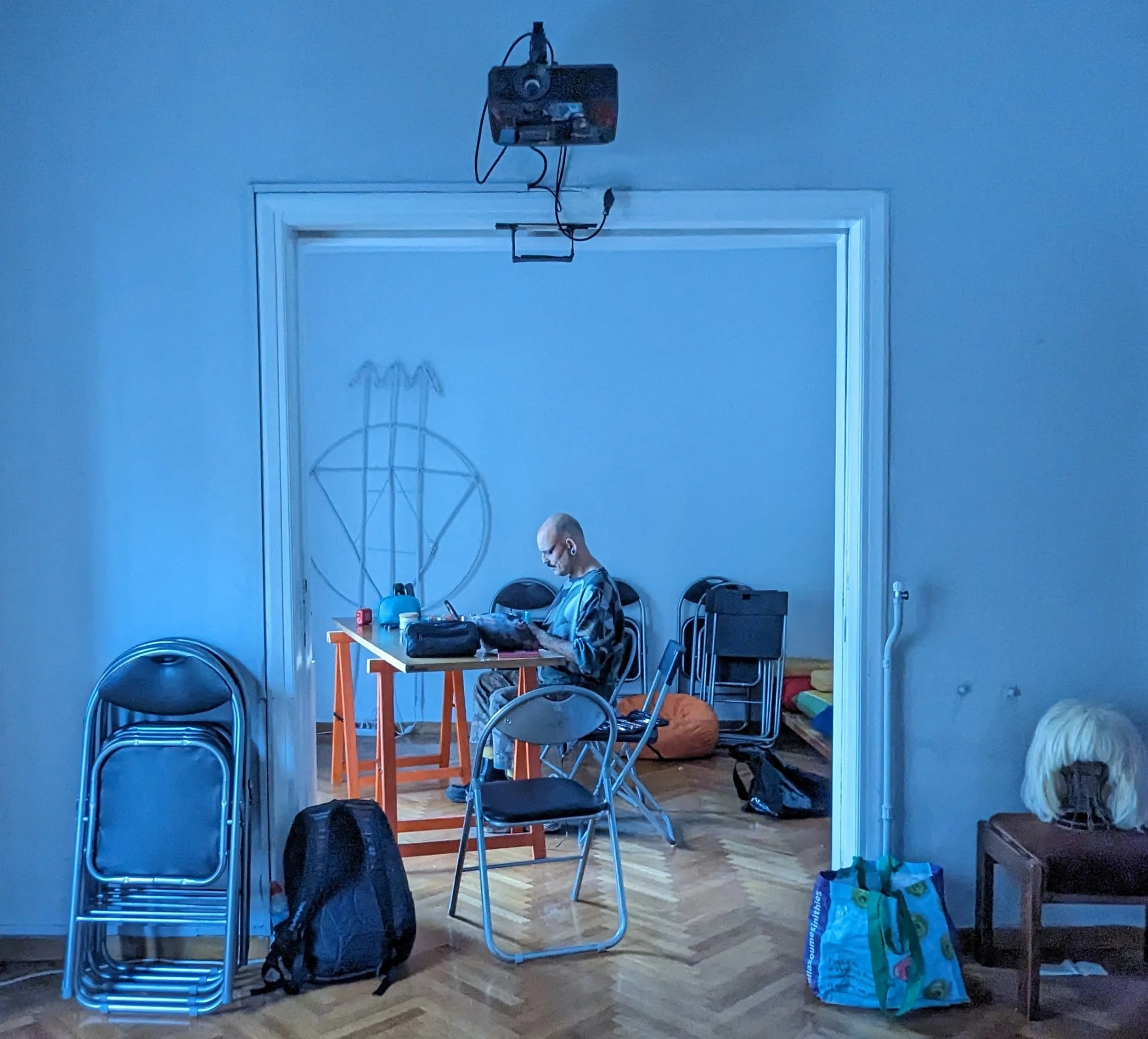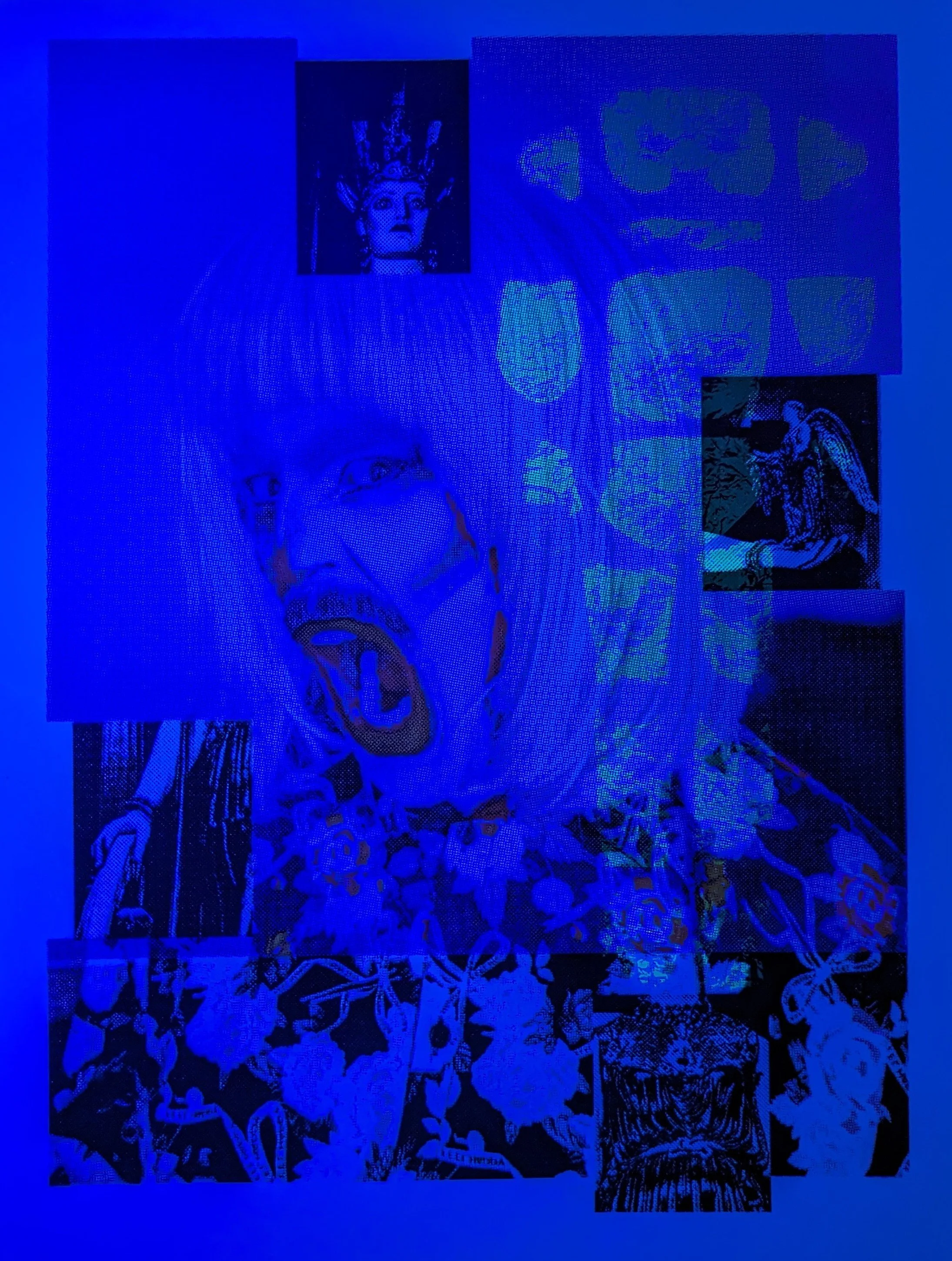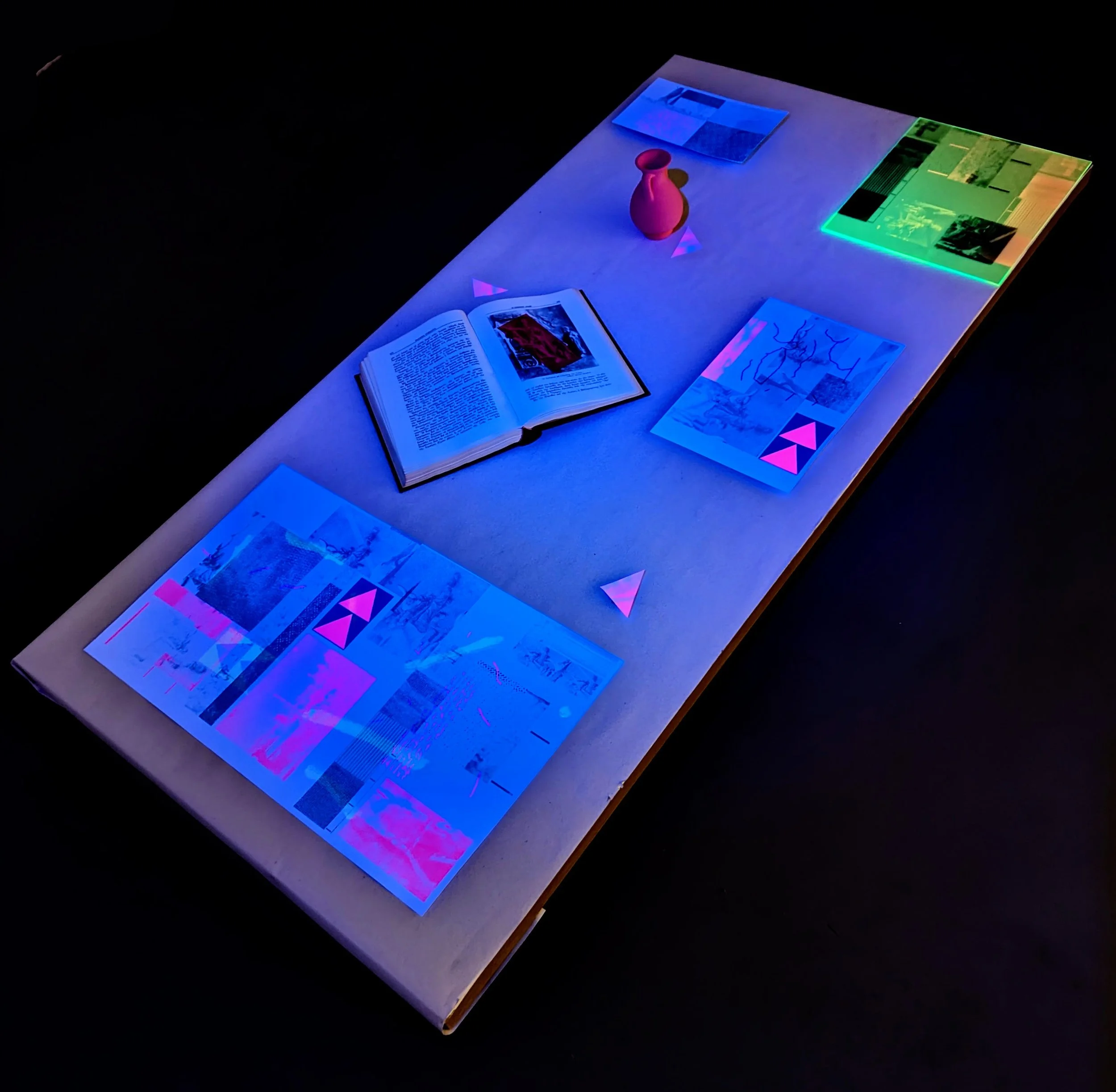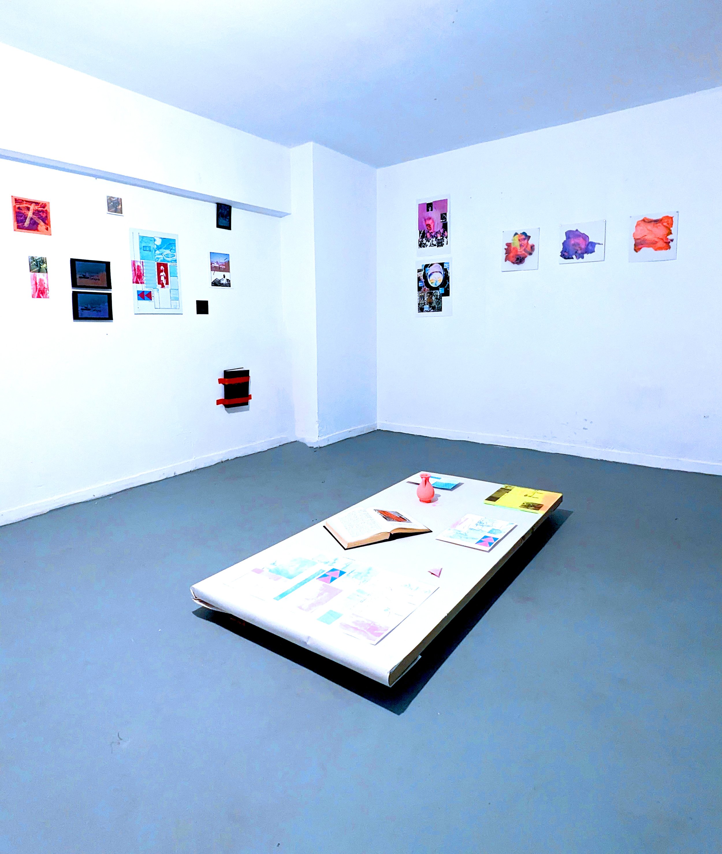 L’exposition Famille choisie présenta un corpus d’œuvres composé d’estampes fluorescentes imprimées sur différentes matières (papiers, plexiglass et films transparents), de céramiques, de photographies et de livres anciens, permettant aux visiteur.ses de découvrir les recherches effectuées autour de ce concept lors d’une résidence au Kypseli Print Studio d’Athènes en 2023. Plusieurs œuvres y figurant ont été produites à la suite d’une série de rencontres réalisées avec Kangela Tromokratisch, drag-queen et militante grecque ainsi qu’avec des membres du centre communautaire LALA d’Athènes.